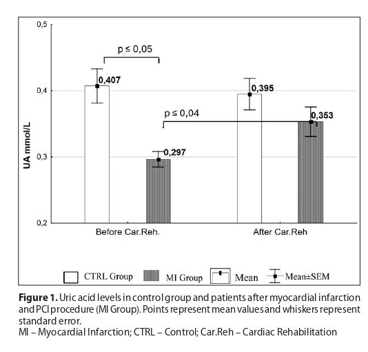 After cardiac rehabilitation, the MI group had significantly higher plasma concentrations of UA, AOPP, and
