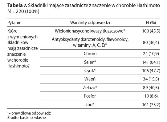 is a common cause of hypothyroidism. Effective treatment requires a proper diet and consideration of interactions between medications and nutrients. The aim of this study was to assess patients’ knowledge of nutrition in the course of Hashimoto’s disease.