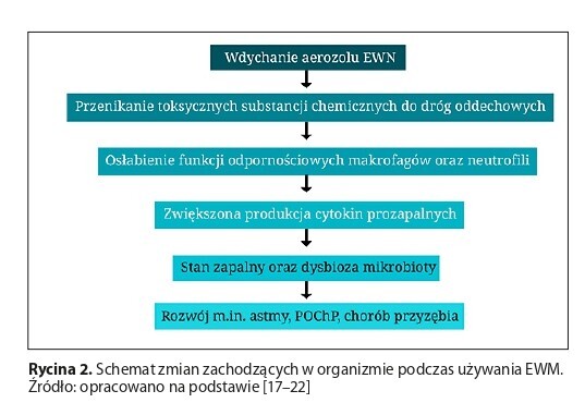 In Poland, the number of e-cigarette units sold in 2023 reached 100 million. The ENDS aerosol can significantly disrupt the microbial balance, increasing the number of pathogenic microorganisms. Various chemical substances, such as nicotine, heavy metals, and aldehydes, may damage mucosal membranes, induce oxidative stress, and increase the production of pro-inflammatory cytokines, ultimately contributing to the development of numerous respiratory pathologies. Exposure to the aerosol significantly contributes to the exacerbation of asthma attacks and increases the risk of developing chronic obstructive pulmonary disease (COPD).