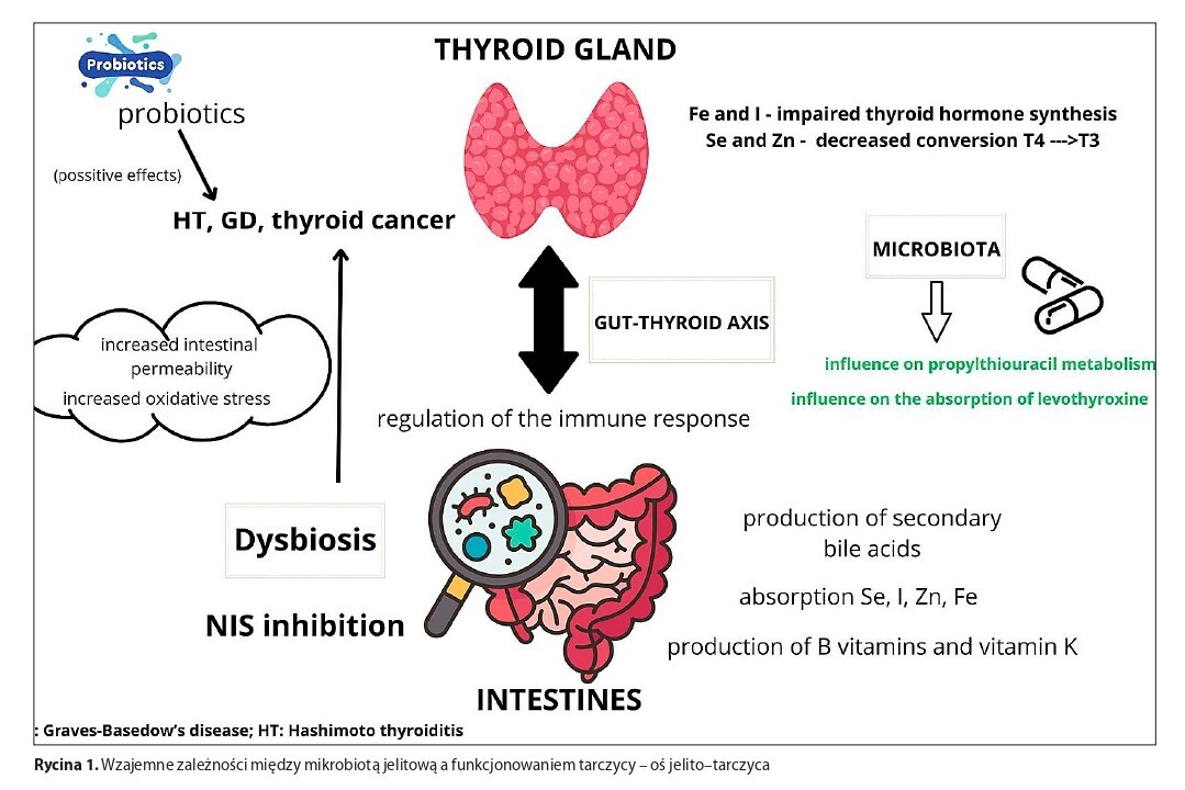 The composition of the microbiota influences the availability of micronutrients, such as iodine, iron, copper, selenium, zinc, and vitamin D, which support thyroid function. Changes in the composition of the microbiota, leading to disruption of the intestinal barrier, may contribute to the development of autoimmune thyroid diseases. Supplementation with probiotics may improve microbial balance and support thyroid function.